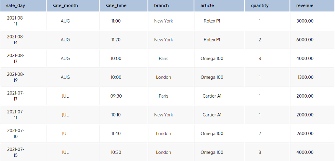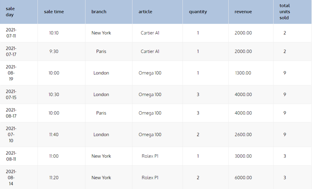 This query will show all the records of the sales table with a new column displaying the total number of units sold for the relevant article. We can obtain the quantity of units sold using the SUM aggregation function, but then we couldn’t show the individual records.
